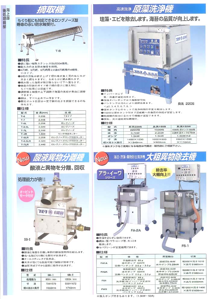 フルタ 摘取機、原藻清浄機、酸液異物分離機、大粗異物除去機