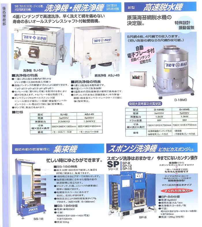 フルタ 洗浄機・網洗浄機、高速脱水機、集束機、スポンジ洗浄機