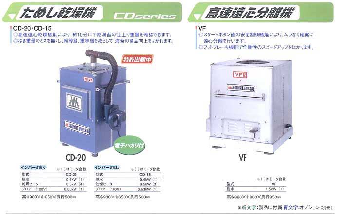 ワタナベ 反転海苔網洗機、ためし乾燥機、高速遠心分離器
